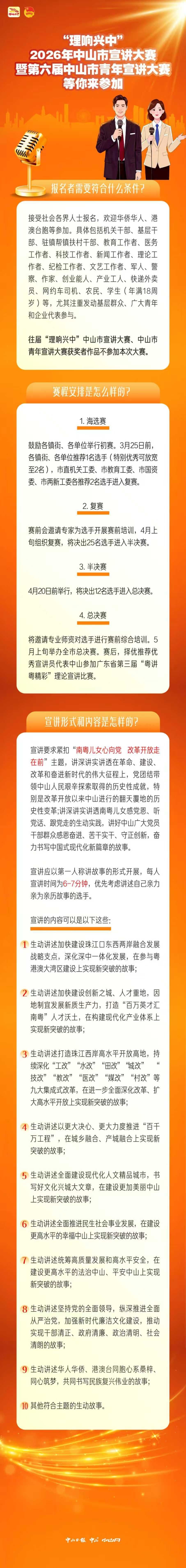 為深入學(xué)習(xí)貫徹習(xí)近平新時代中國特色社會主義思想和黨的二十屆四中全會精神,貫徹落實(shí)習(xí)近平總書記對廣東系列重要講話、重要指示精神,慶祝中國共產(chǎn)黨成立105周年,認(rèn)真落實(shí)省委“1310”具體部署和市委強(qiáng)鎮(zhèn)興村富民“13388”行動,持續(xù)推進(jìn)“強(qiáng)國復(fù)興有我”群眾性宣傳教育活動,根據(jù)廣東省第三屆“粵講粵精彩”理論宣講比賽安排,中共中山市委宣傳部、中共中山市紀(jì)律檢查委員會、共青團(tuán)中山市委員會聯(lián)合舉辦“理響興中”2026年中山市宣講大賽暨第六屆中山市青年宣講大賽,詳情如下: