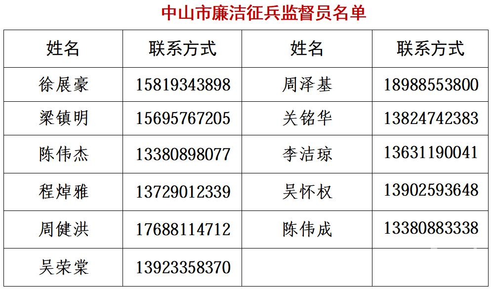 為嚴明兵員征集紀律,筑牢廉潔征兵底線,進一步提升征兵工作透明度,中山市征兵辦將2026年我市廉潔征兵監(jiān)督員名單及監(jiān)督舉報電話、郵箱予以公布。廣大市民若發(fā)現(xiàn)征兵違法違紀線索或廉潔征兵問題,可向廉潔征兵監(jiān)督員反映舉報,也可直接撥打省、市監(jiān)督舉報電話,或發(fā)送郵件至指定信箱反饋。