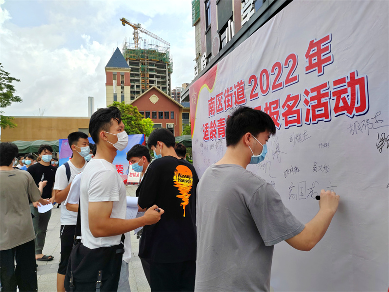 體檢現(xiàn)場,南區(qū)街道嚴格按照標準設(shè)置,通過懸掛征兵標語、張貼海報、使用LED屏播放征兵宣傳片等方式,營造濃厚氛圍。事前,南區(qū)街道征兵辦嚴格落實常態(tài)化疫情防控要求,提前收集、核查好參檢青年的粵康碼、行程卡、核酸檢測證明等,并對體檢場所進行全面消毒處理,保持體檢站分離通風(fēng)。參檢人員全程佩戴口罩,分批分流進行體檢,確保體檢工作平穩(wěn)有序開展。  ▲適齡青年參加體檢簽名