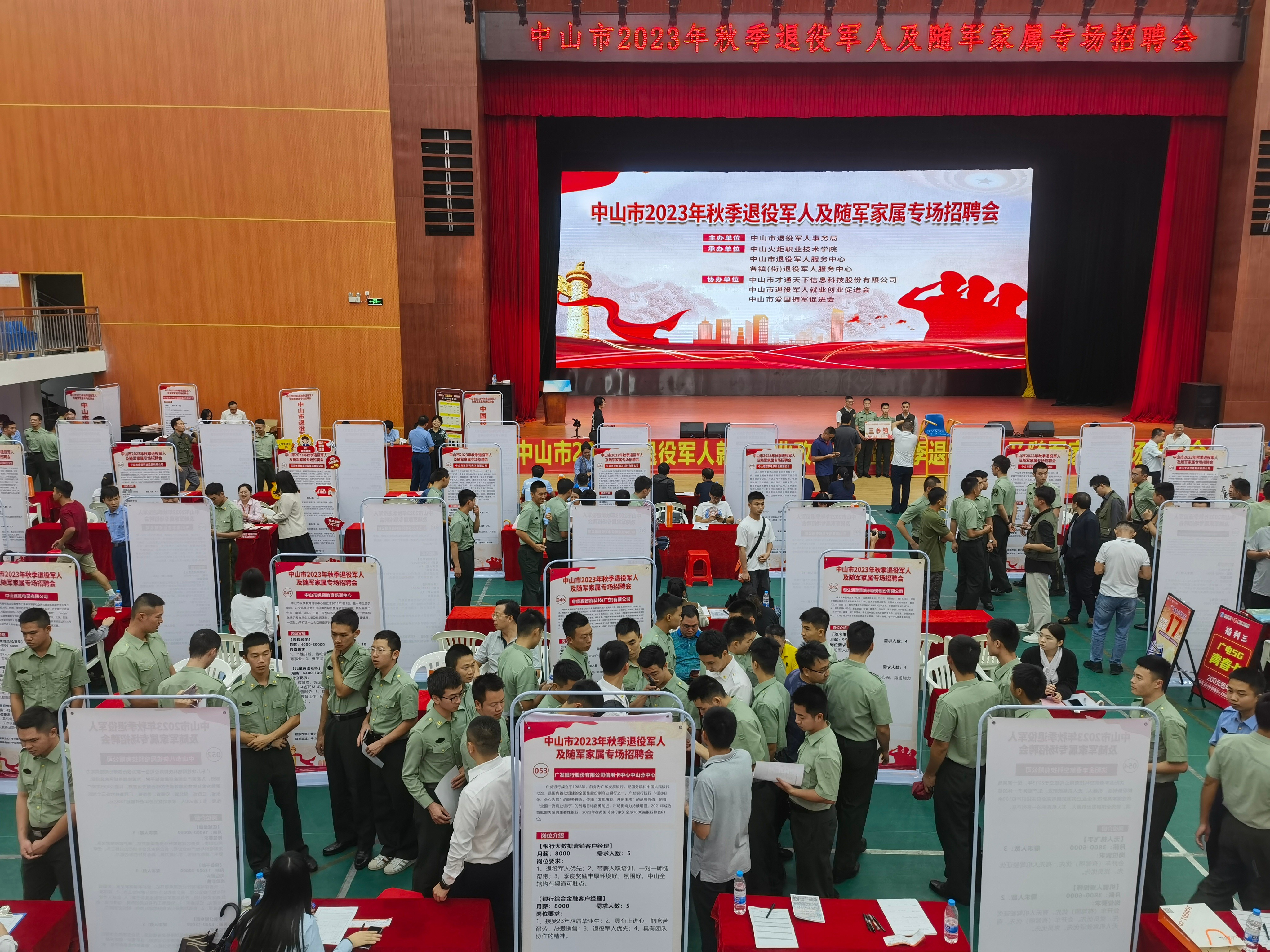 中山市2023年秋季退役軍人及隨軍家屬專場(chǎng)招聘會(huì)現(xiàn)場(chǎng)。(市退役軍人事務(wù)局供圖) 為深入開展“我為群眾辦實(shí)事”實(shí)踐活動(dòng),推動(dòng)主題教育走深走實(shí)、見行見效,10月20日下午,中山市2023年秋季退役軍人及隨軍家屬專場(chǎng)招聘會(huì)在中山火炬職業(yè)技術(shù)學(xué)院體育館成功舉辦。專場(chǎng)招聘會(huì)由中山市退役軍人事務(wù)局主辦,中山火炬職業(yè)技術(shù)學(xué)院、中山市退役軍人服務(wù)中心、各鎮(zhèn)(街)退役軍人服務(wù)中心承辦,中山市才通天下信息科技股份有限公司、中山市退役軍人就業(yè)創(chuàng)業(yè)促進(jìn)會(huì)、中山市愛國(guó)擁軍促進(jìn)會(huì)協(xié)辦。