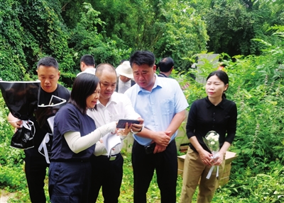 市退役軍人事務局負責人向荊門市退役軍人事務局有關人士了解甘和順烈士墓的保護情況。通訊員供圖
