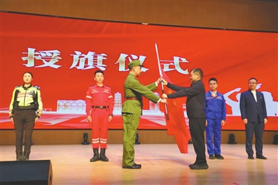 “戎耀香山”老兵宣講工作室負(fù)責(zé)人李克在中山市“理響興中”宣講團(tuán)授旗儀式上接旗。(資料圖片)