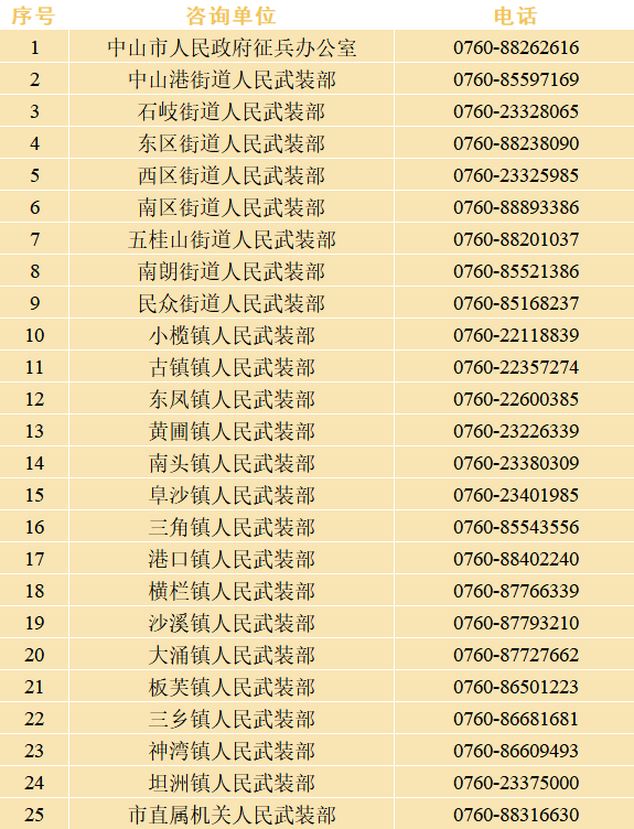 2025年全國征兵(男兵)應(yīng)征報(bào)名已于12月1日開始。記者從中山市人民政府征兵辦公室獲悉,即日起,符合條件的青年可通過官方渠道報(bào)名參軍,對于征兵政策和流程存有疑問的市民,可通過撥打各鎮(zhèn)街征兵咨詢電話獲得詳細(xì)解答。 應(yīng)征報(bào)名(男兵) 應(yīng)征報(bào)名提示:男兵報(bào)名前須完成兵役登記 全國征兵(男兵)2025年應(yīng)征報(bào)名時(shí)間 上半年應(yīng)征報(bào)名:2024年12月1日至2025年2月10日24時(shí) 下半年應(yīng)征報(bào)名:2024年12月1日至2025年8月10日24時(shí) 男兵應(yīng)征報(bào)名對象 高中(含中專、職高、技校)畢業(yè)生及以上文化程度的青年(含高校在校生),年滿18至22周歲(2003年1月1日——2007年12月31日出生);普通高等學(xué)校本??飘厴I(yè)生、上半年符合畢業(yè)條件的畢業(yè)班學(xué)生,年滿18至24周歲;研究生畢業(yè)生及在校生放寬至26周歲;初中畢業(yè)文化程度男青年,年滿18至20周歲。 應(yīng)征報(bào)名(女兵) 全國征兵(女兵)2025年應(yīng)征報(bào)名時(shí)間 上半年應(yīng)征報(bào)名:2025年1月1日至2025年2月10日24時(shí) 下半年應(yīng)征報(bào)名:2025年7月1日至2025年8月10日24時(shí) 女兵應(yīng)征報(bào)名對象 上半年應(yīng)征報(bào)名:普通高等學(xué)校和科研機(jī)構(gòu)全日制應(yīng)屆畢業(yè)生及在校生,年滿18至22周歲(2003年1月1日——2007年12月31日出生),全日制研究生應(yīng)屆畢業(yè)生及在校生放寬至26周歲;2024年普通高等學(xué)校全日制本??茟?yīng)屆畢業(yè)生可以報(bào)名參加2025年上半年女兵征集,年齡放寬至23周歲。 下半年應(yīng)征報(bào)名:普通高中應(yīng)屆畢業(yè)生、普通高等學(xué)校和科研機(jī)構(gòu)全日制應(yīng)屆畢業(yè)生及在校生,年滿18至22周歲(2003年1月1日——2007年12月31日出生),全日制研究生應(yīng)屆畢業(yè)生及在校生放寬至26周歲。 報(bào)名方式 報(bào)名方式征兵報(bào)名官方網(wǎng)站:全國征兵網(wǎng) www.gfbzb.gov.cn 軍隊(duì)媒體移動(dòng)旗艦客戶端:中國軍號(hào)App 中山各鎮(zhèn)街征兵咨詢電話