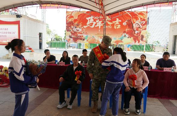 佩戴紅花與綬帶,贈送鮮花 橫門小學(xué)的少先隊(duì)員滿懷敬意地為新兵佩戴上“光榮入伍”的綬帶、大紅花并贈送鮮花。 橫門社區(qū)黨總支書記致辭 橫門社區(qū)黨總支書記、居委會主任馮劍明向光榮入伍的新兵表示熱烈祝賀,向積極送子參軍、支持國防建設(shè)的新兵家長們致以崇高的敬意。他指出,人民軍隊(duì)是磨煉意志、培養(yǎng)人才的大學(xué)校、大熔爐,希望新兵到部隊(duì)后,努力成為一名政治合格、軍事過硬、作風(fēng)優(yōu)良的優(yōu)秀軍人,為家鄉(xiāng)人民爭光,為國防事業(yè)貢獻(xiàn)力量。 發(fā)放獎勵金、紀(jì)念品與“光榮之家”牌匾