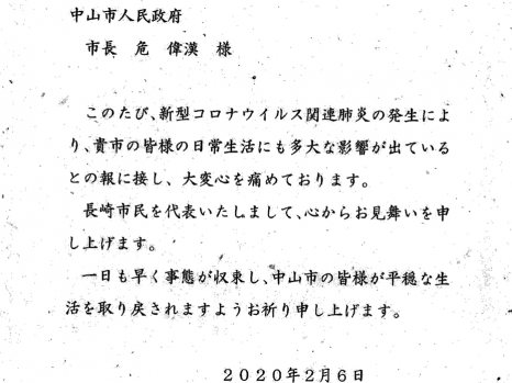 長崎市市長田上富久致中山市的慰問信及譯文