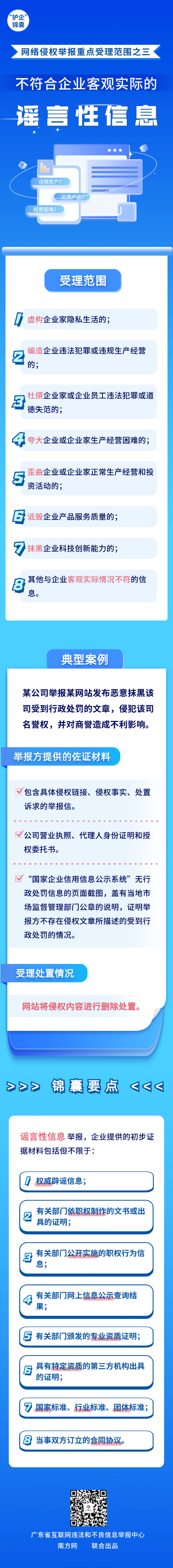為有效助力企業(yè)維護自身網(wǎng)絡(luò)合法權(quán)益,廣東省互聯(lián)網(wǎng)違法和不良信息舉報中心精心準備了“護企”錦囊,結(jié)合案例帶大家了解涉企網(wǎng)絡(luò)侵權(quán)信息的重點受理范圍,今天推出重點受理范圍之三——不符合企業(yè)客觀實際的謠言性信息。