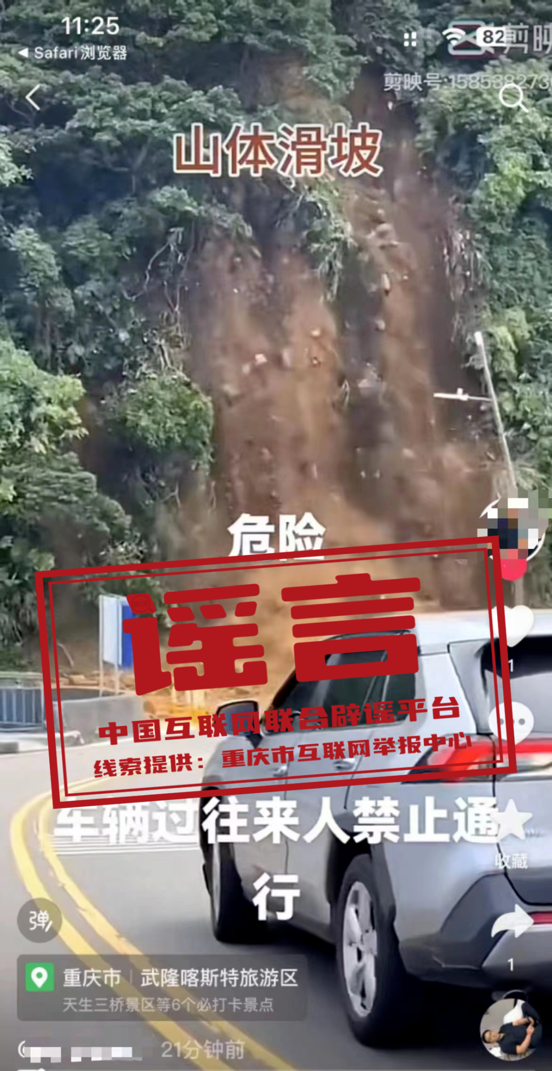 真相:近日,有網(wǎng)民發(fā)布了一則“山體滑坡危險(xiǎn),過往車輛行人禁止通行”的視頻,視頻定位標(biāo)注為“重慶市武隆喀斯特旅游區(qū)”。經(jīng)重慶市武隆區(qū)多部門核實(shí),該區(qū)近期未發(fā)生大面積山體滑坡事件。網(wǎng)傳視頻實(shí)為2024年6月3日臺(tái)灣省基隆市中正區(qū)潮境公園入口發(fā)生的大規(guī)模山體滑坡事件,而視頻中所標(biāo)注的定位信息系網(wǎng)民發(fā)布視頻的地點(diǎn),而非事件發(fā)生的地點(diǎn)。(來源:“重慶辟謠”微信公眾號(hào)、網(wǎng)信武隆)