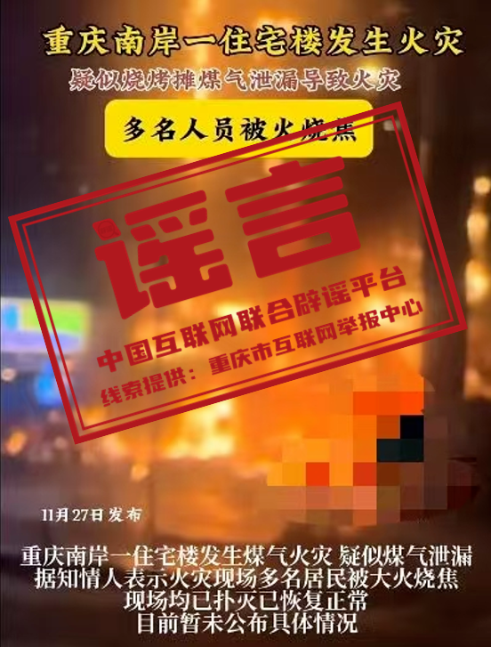 真相:11月27日,有自媒體發(fā)布視頻稱“重慶南岸一住宅樓發(fā)生火災,火災現(xiàn)場多名居民被大火燒焦”“南坪大火現(xiàn)已失去生命19人”,引發(fā)關注。經(jīng)當?shù)叵谰仍块T初步核實,網(wǎng)傳信息系謠言。當日,重慶市南岸區(qū)消防救援局發(fā)布警情通報稱,2024年11月26日23時39分,南岸區(qū)江南大道66號一住宅發(fā)生火災,現(xiàn)場1人受傷,已送醫(yī)院全力救治?;馂脑驗?樓面館經(jīng)營人員操作不當,導致灶臺起火引燃周邊可燃物所致,火勢沿外墻向上蔓延。(來源:“重慶辟謠”微信公眾號)