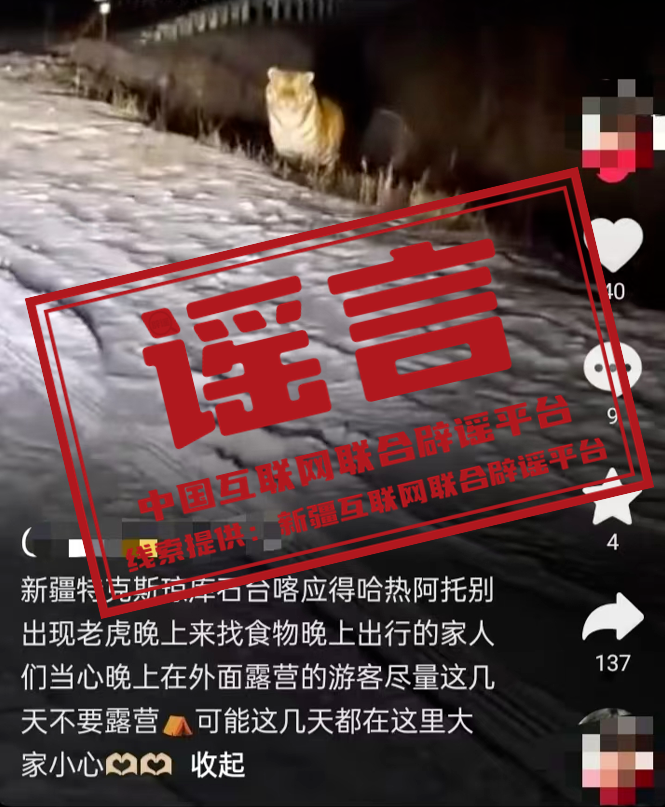 真相:近期,有網(wǎng)民發(fā)布視頻稱:“新疆特克斯縣瓊庫什臺村出現(xiàn)老虎,晚上出行的家人們當心,在外露營的家人們這幾天不要露營?!苯?jīng)特克斯縣林業(yè)和草原局核實,瓊庫什臺牧業(yè)村附近未發(fā)現(xiàn)過老虎蹤跡,該地自然環(huán)境也不適合老虎生存,該信息屬于謠言。(來源:“新疆網(wǎng)絡辟謠”微信公眾號)