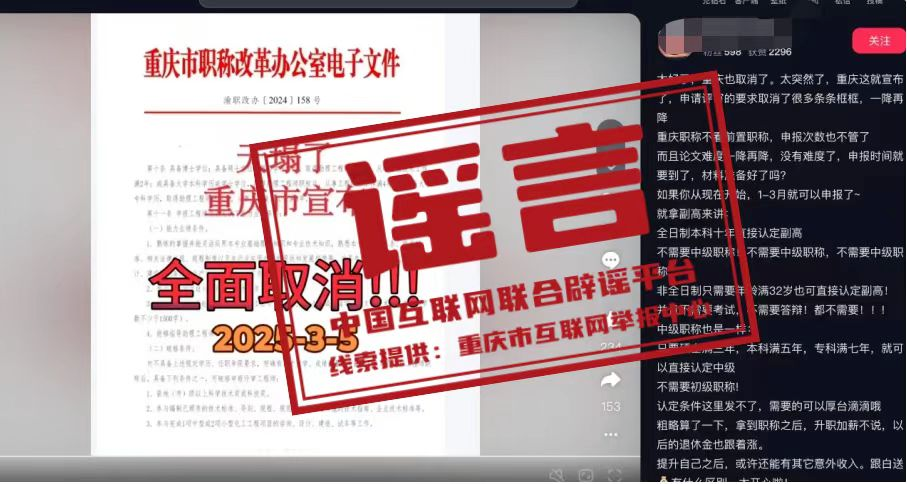 真相:近日,有網(wǎng)民在互聯(lián)網(wǎng)平臺(tái)發(fā)布消息稱“重慶市宣布,申請(qǐng)?jiān)u審的要求取消了很多條條框框,職稱申請(qǐng)不看前置職稱,全日制本科十年直接認(rèn)定副高,不需要中級(jí)職稱”,引發(fā)關(guān)注。經(jīng)核實(shí),網(wǎng)傳信息系謠言。職稱評(píng)審均需逐級(jí)晉升,取得上一級(jí)職稱并滿足相應(yīng)學(xué)歷資歷條件后方可晉升高一級(jí)職稱。目前重慶市除特殊人才、博士后等3個(gè)針對(duì)特定對(duì)象的職稱申報(bào)綠色通道外,正常申報(bào)通道均需逐級(jí)晉升。網(wǎng)傳文件是網(wǎng)民通過(guò)P圖軟件編輯而成,試圖吸引不明真相的群眾咨詢,借機(jī)推銷職稱代辦服務(wù),收取高額費(fèi)用。目前,謠言線索已轉(zhuǎn)交公安機(jī)關(guān)進(jìn)一步調(diào)查處置。(來(lái)源:“重慶辟謠”微信公眾號(hào))